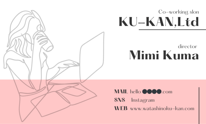 架空のコワーキングサロンの女性責任者をペルソナと設定し、ビジネスカード、社会といった硬いイメージに相反するように優しいピンクを用い柔らかさのある名刺を作成しました。